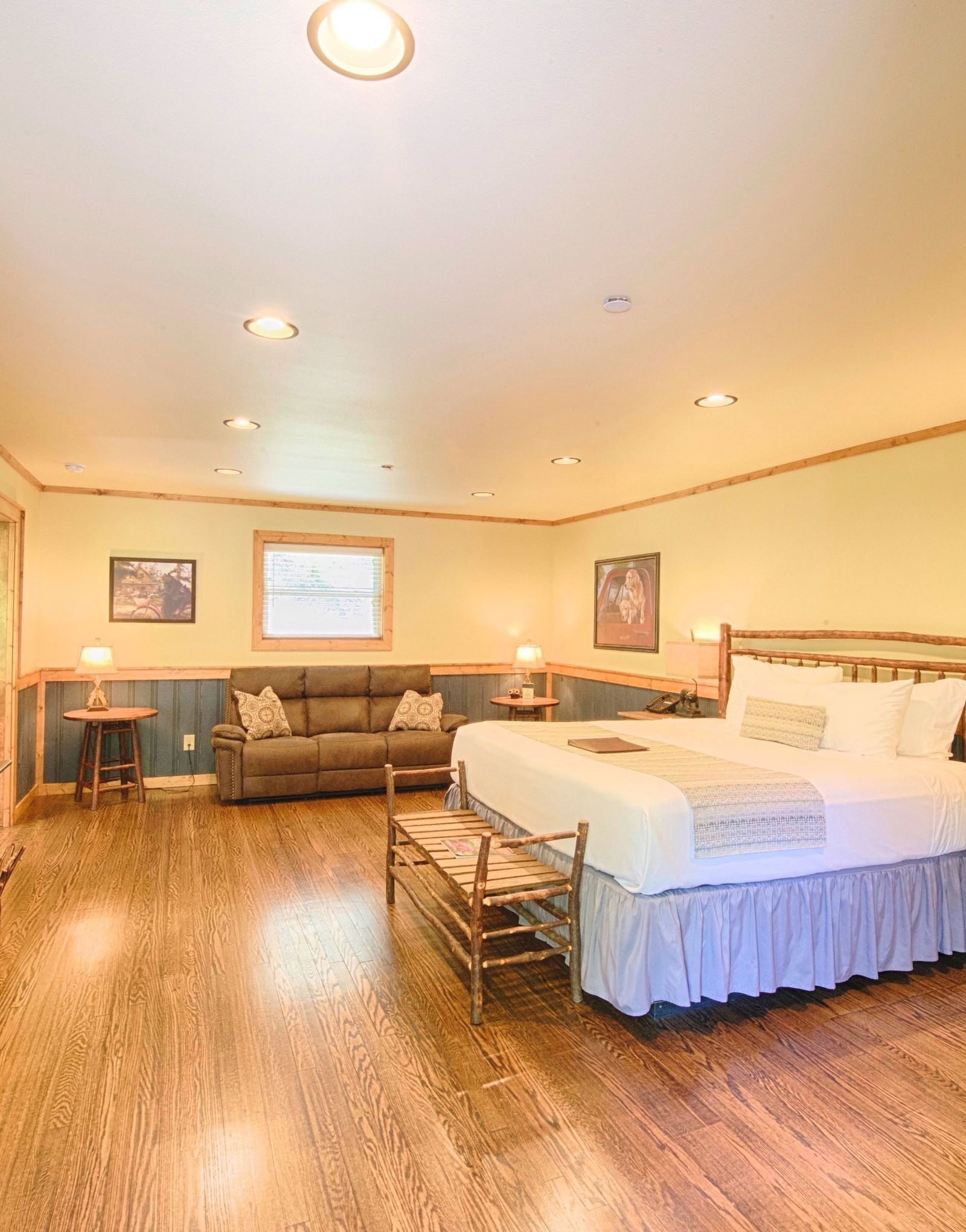 Alcoa Cabin Room One features a plush king size bed, sofa, and a second bedroom with a double bed. A large private bath, a deck with mountain views, a hot tub, and a connecting door to Alcoa Cabin Room Two.